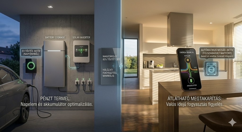 Az okosenergia-vezérlés nem csak a fogyasztás méréséről szól, hanem a termelés és felhasználás optimalizálásáról. Ha van napeleme, a háza tudja, mikor süti a legintenzívebben a nap: ekkor feltölti az energiatárolókat vagy felfűti a hőtárolós tartályt, hogy a megtermelt energiát ne adjuk el fillérekért, hanem saját magunk hasznosítsuk.