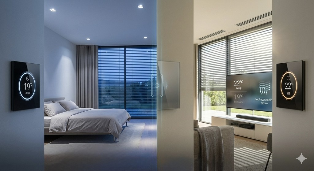 Míg a világítás a hangulatért felel, a fűtés, hűtés és árnyékolás az otthona láthatatlan védőpajzsa. Ez már nem csak kényelem, hanem tiszta logika: a háza nem a klímát kínozza, ha kisüt a nap, hanem leengedi a redőnyöket, mielőtt a szoba túlhevülne. Télen pedig épp fordítva: beengedi a napfényt, hogy ingyen fűtse fel a helyiségeket.